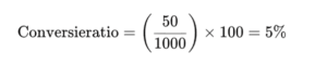 Voorbeeld: Stel je hebt een e-commerce website en 1.000 bezoekers komen naar je site in een maand. Tijdens die maand doen 50 bezoekers een aankoop. De conversieratio voor deze maand zou zijn: